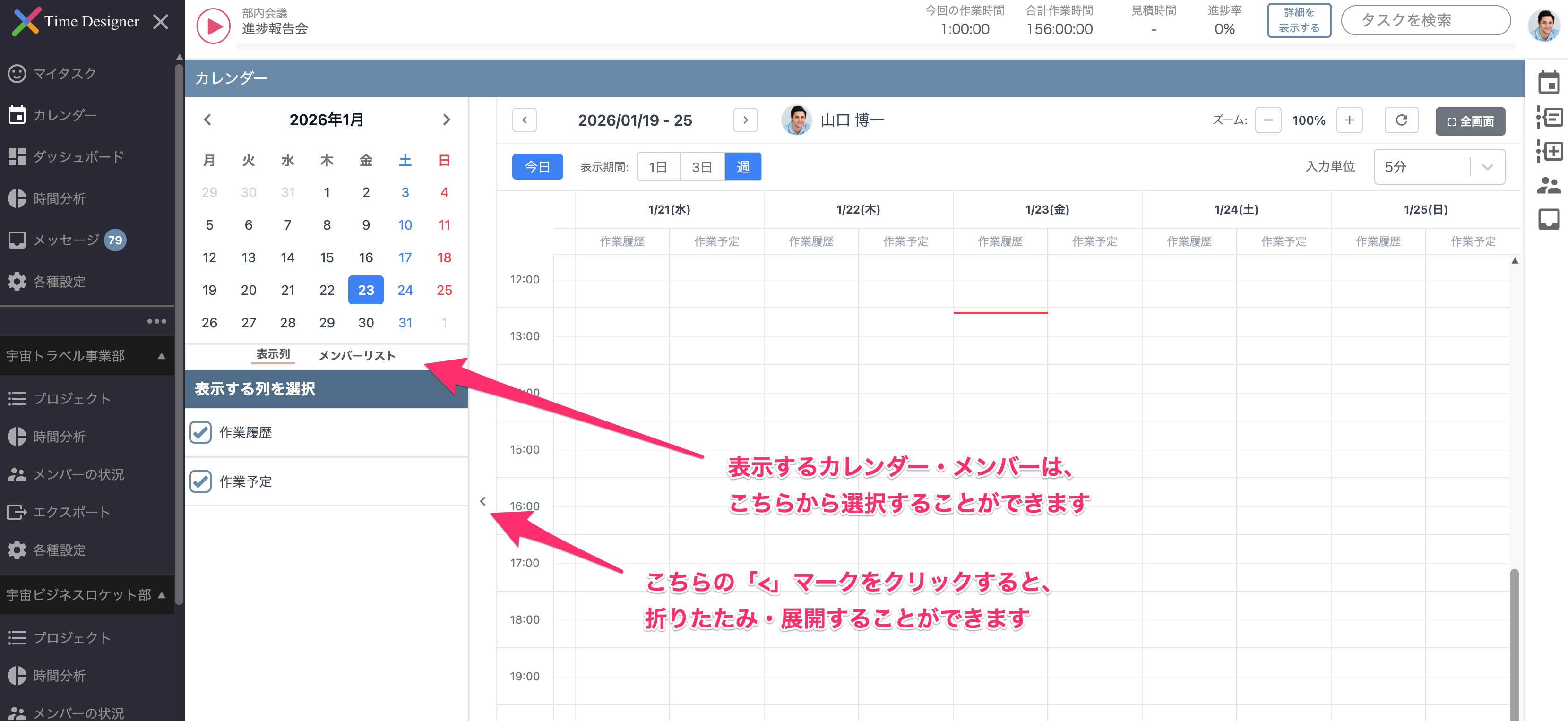 また、もともとカレンダー画面の上部にあった、表示するカレンダー・メンバーの選択機能については、 左側のサイドメニューに移動しております。