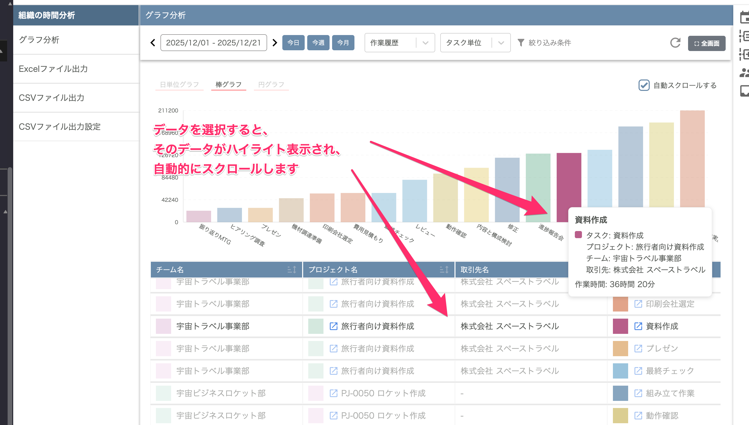 時間分析画面のグラフ表示について、 グラフやデータ表の部分に、マウスカーソルを合わせると、 該当のデータがハイライト表示されるようになりました。