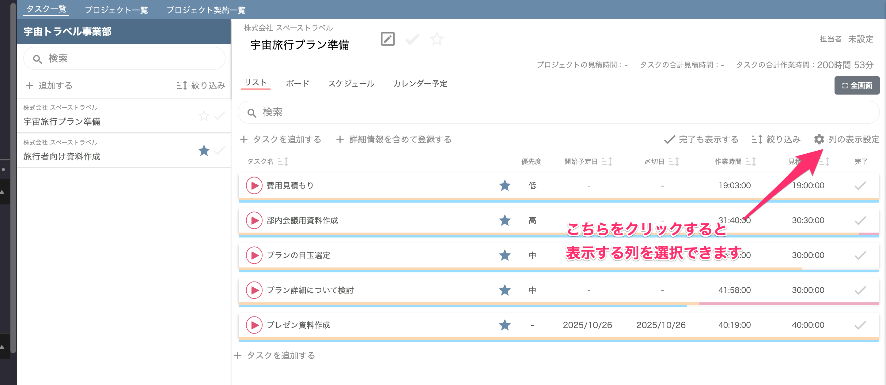 タスク一覧画面などの画面で、一覧の右上に「列の表示設定」というメニューが追加されました。 こちらをクリックすると、画面に表示するデータの列を選択することができます。